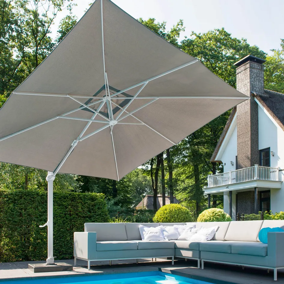 In addition to the extra space, the construction of this parasol allows you to achieve larger dimensions with a maximum of 4x3 meters. Also, a cantilever parasol is more versatile in creating shade in the right place. Each cantilever parasol can be rotated and the parasol can be tilted. Not for nothing do we see that cantilever parasols have been on the rise in recent years. Choose a matching parasol base that is heavy enough to keep your cantilever parasol stable. A cantilever parasol catches wind, so when winds are harder than wind force 4, then it is wise to fold your cantilever parasol back in.